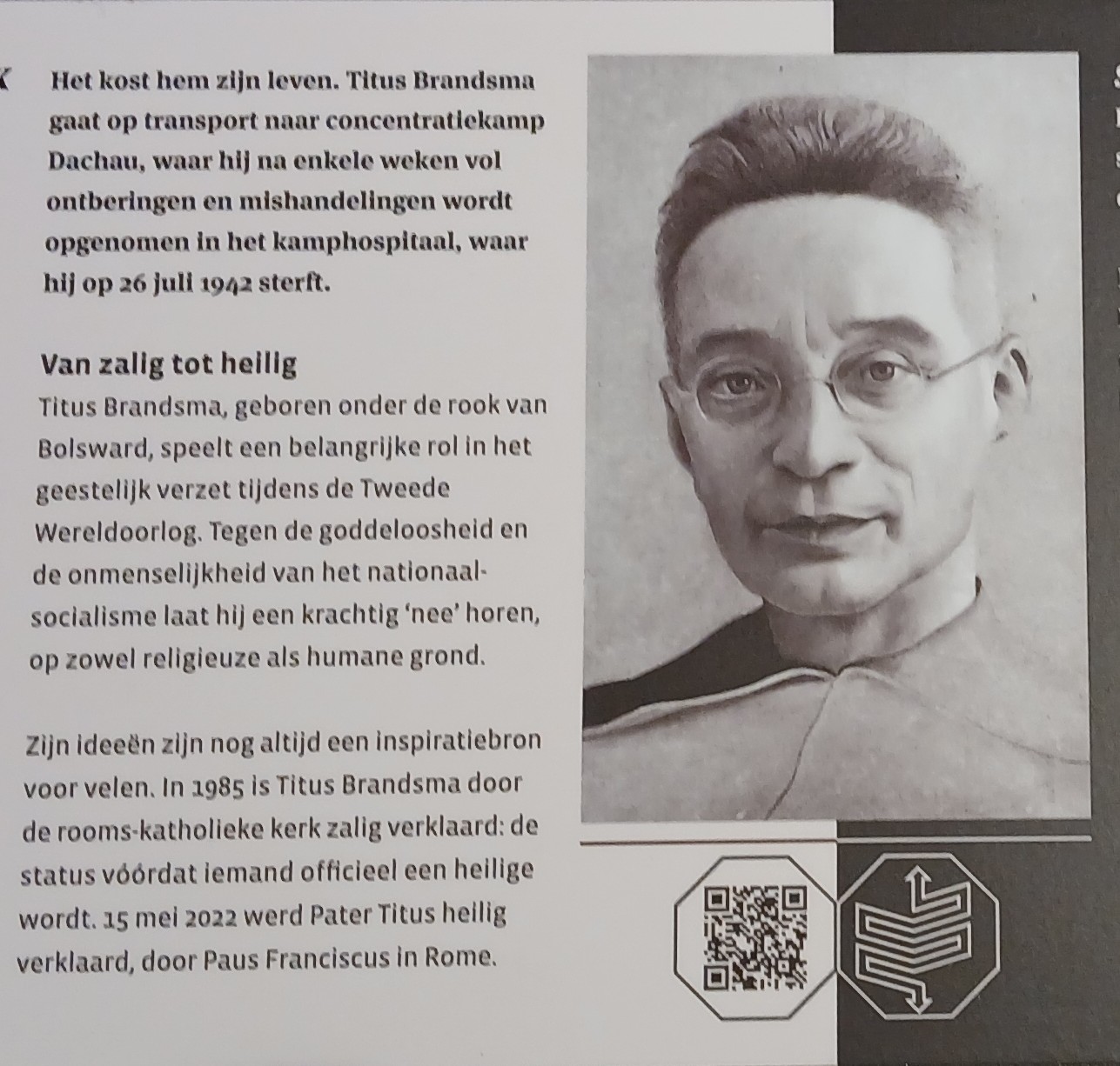 Het thema van Tsjerkepaad was dit jaar: levende stenen. Daar wij in onze kerk binding hebben met twee geestelijke ‘keien’, inspirerende mensen, uit het verleden, die nog steeds een stimulans zijn voor een gelovig, liefdevol leven, hebben wij naar aanleiding daarvan in onze vitrinekasten een kleine tentoonstelling gewijd aan Pastoor Romkes van de Wal en Pater Titus Brandsma. Ook was een filmpje van Pastoor Van der Wal te zien, waarin hij vertelt hoe zijn loopbaan als priester is verlopen.